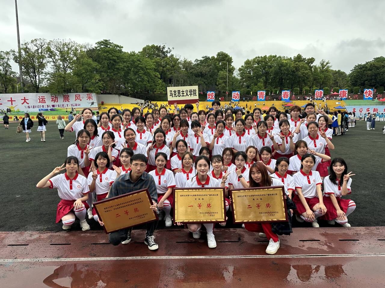 在本次学生组广播体操比拼中,同学们精神洋溢,动作整齐划一,表现出色,荣获一等奖的优异成绩;在健康达人挑战赛中,我院学子挥洒汗水,也取得了团体二等奖的优异成绩。这些耀眼的胜利是马院运动健儿们团结协作、风雨无阻、一路向前、奋力拼搏的结果,他们用汗水谱写了辉煌的篇章!