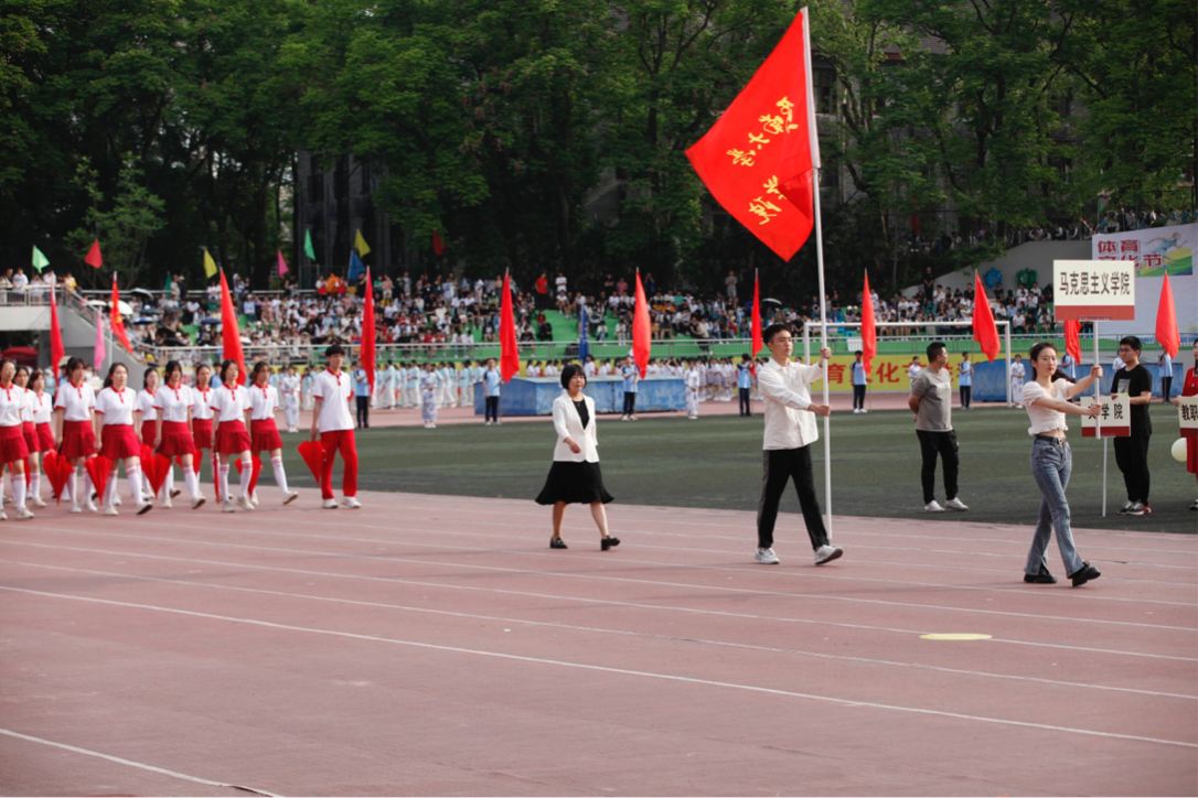 开幕式上,同学们身着红衣,手举红伞,整齐划一踏步前进,“凌云赛场,斗志昂扬,看我马院,锐不可当”,响亮的口号展现马院学子不凡气质,用红伞摆出的国旗形状,更加彰显马院特色,高昂的斗志、焕发的精神给观众留下深刻印象。