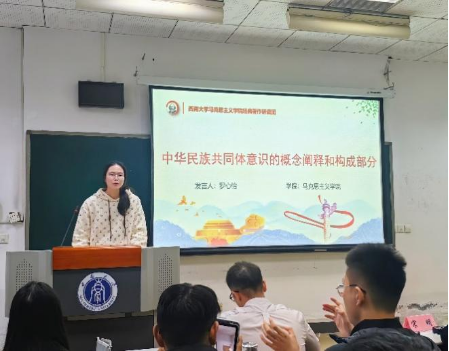 第一位进行主题分享的是来自必赢3003no1线路检测中心的罗心怡同学,她立足于习近平总书记关于“铸牢中华民族共同体意识”的系列重要讲话精神,从概念和内容两个方面与大家进行了分享,对命运共同体意识、政治共同体意识、经济共同体意识、文化共同体意识、社会共同体意识等维度对“中华民族共同体意识”进行了阐释。