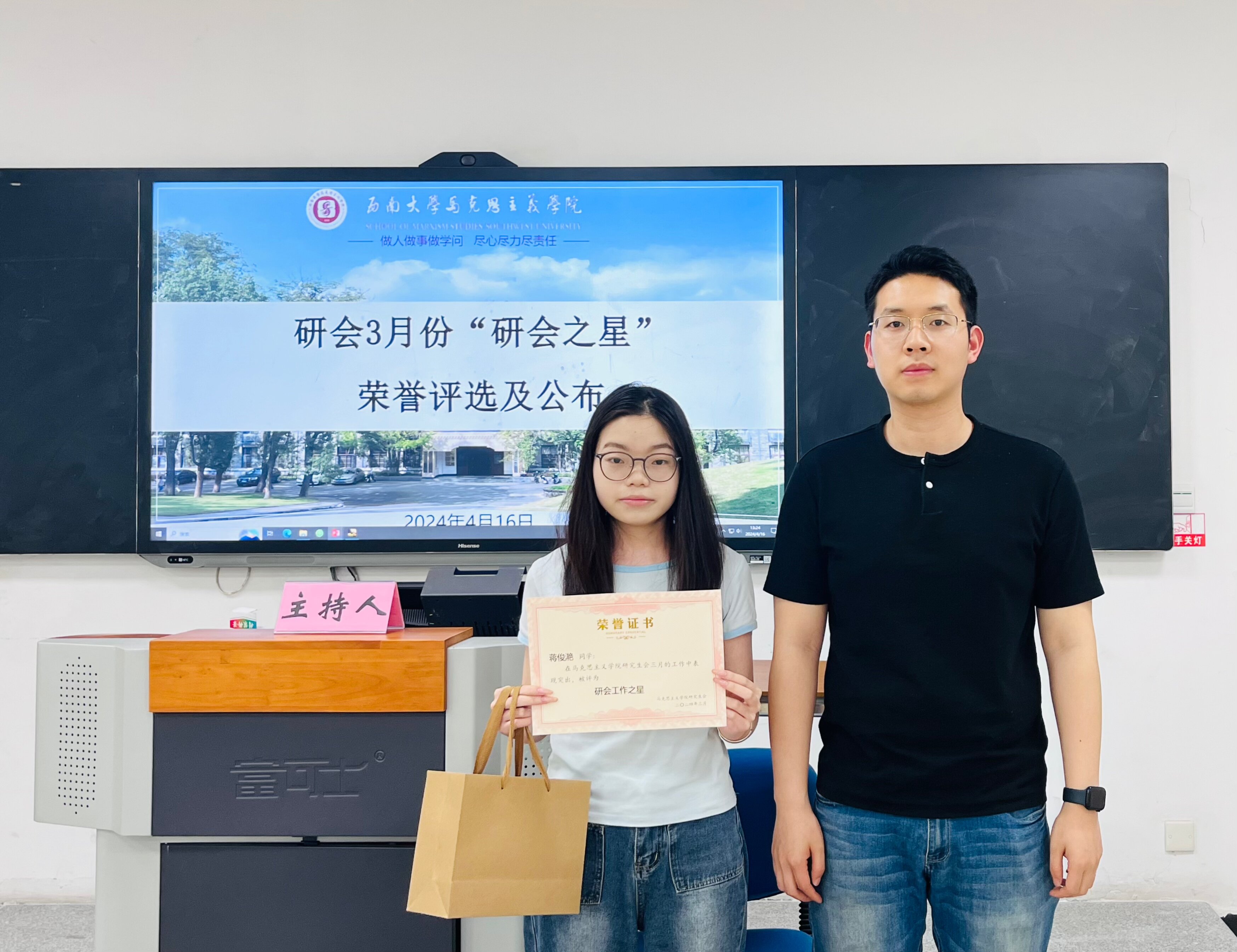研会实践部工作人员蒋俊滟荣获本月“研会之星”的称号。她对上个月的工作进行了总结并分享了个人经验,表示将继续保持初心和激情,认真完成工作,积极参与活动。