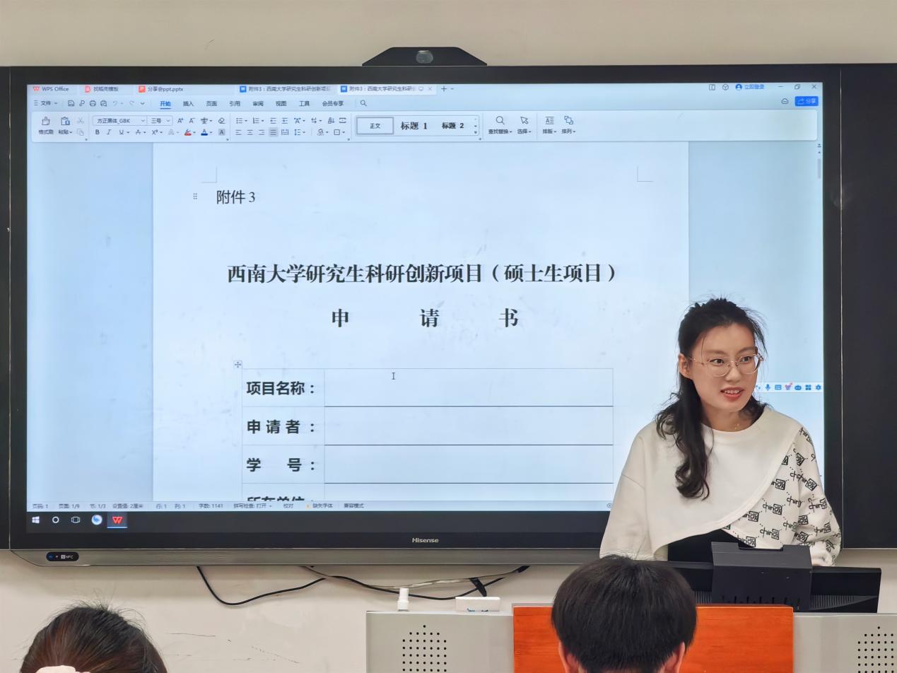 活动的第一个环节,以项目申报经验分享为主题。史家宁同学结合自身实践经验,针对必赢3003no1线路检测中心研究生科研创新项目应如何撰写申请书做出分享。她主要从项目选题、立项依据、以及研究方案三个方面展开。首先,在如何选题这个问题上,她建议可以从与老师研究方向一致、当下热点以及自己的兴趣点这三个方面考虑。其次,立项依据这一部分应囊括项目的研究目的、意义;国内外研究现状分析和发展趋势;项目应用前景和学术价值;现有研究基础条件、手段及指导教师情况等。再者,研究方案应涵盖研究目标、研究内容、研究思路和拟解决的关键问题;拟采取的研究方法及可行性分析;本项目的创新之处以及预期的研究进展。史家宁同学对每一个板块都进行了详细的阐释和举例说明,并指出各个学科专业应根据自己的学科特点进行适当调整。