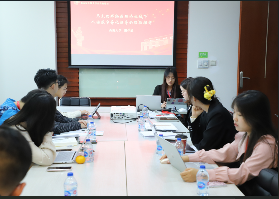 在交流分论坛上,阳作娟同学从问题缘由、逻辑结构、内容分析等角度,针对数智时代下人的数字异化展开分享阐释;刘发鑫同学从选题依据、调研设计等谈起,针对新时代城市社区文化建设的实际困境展开交流探讨。