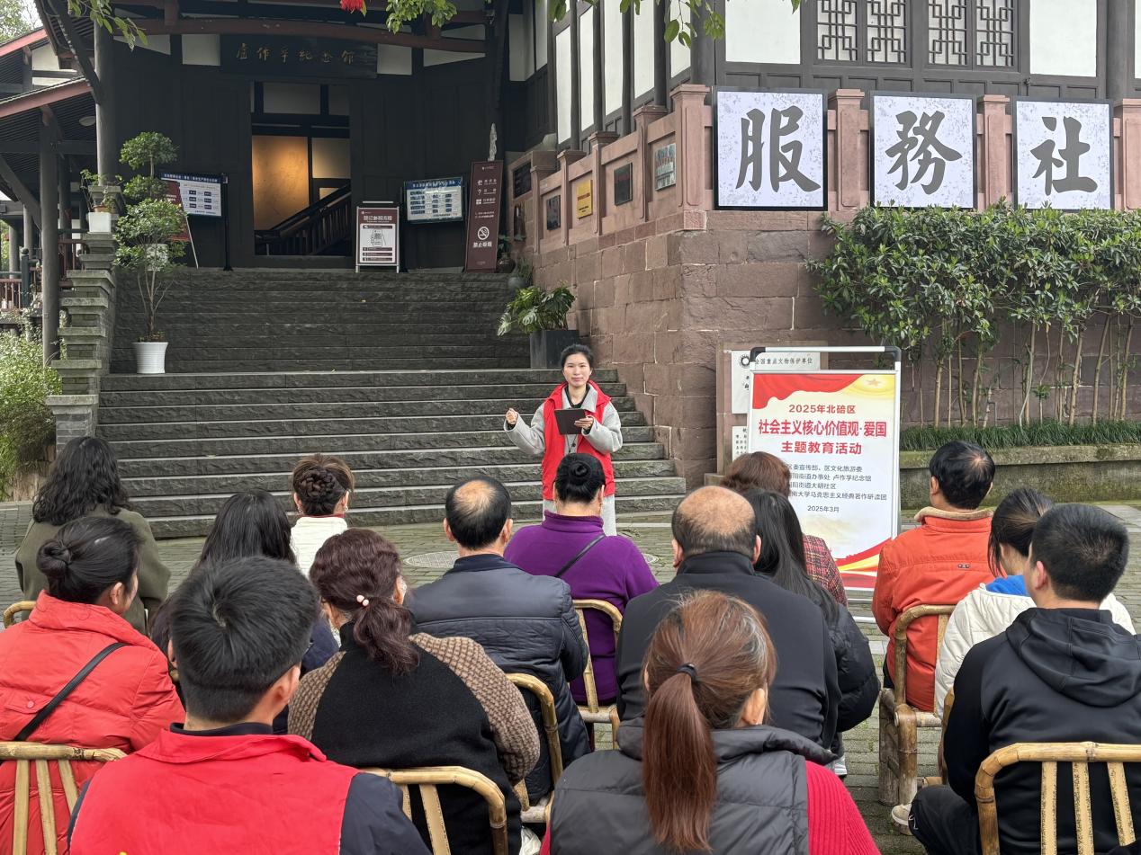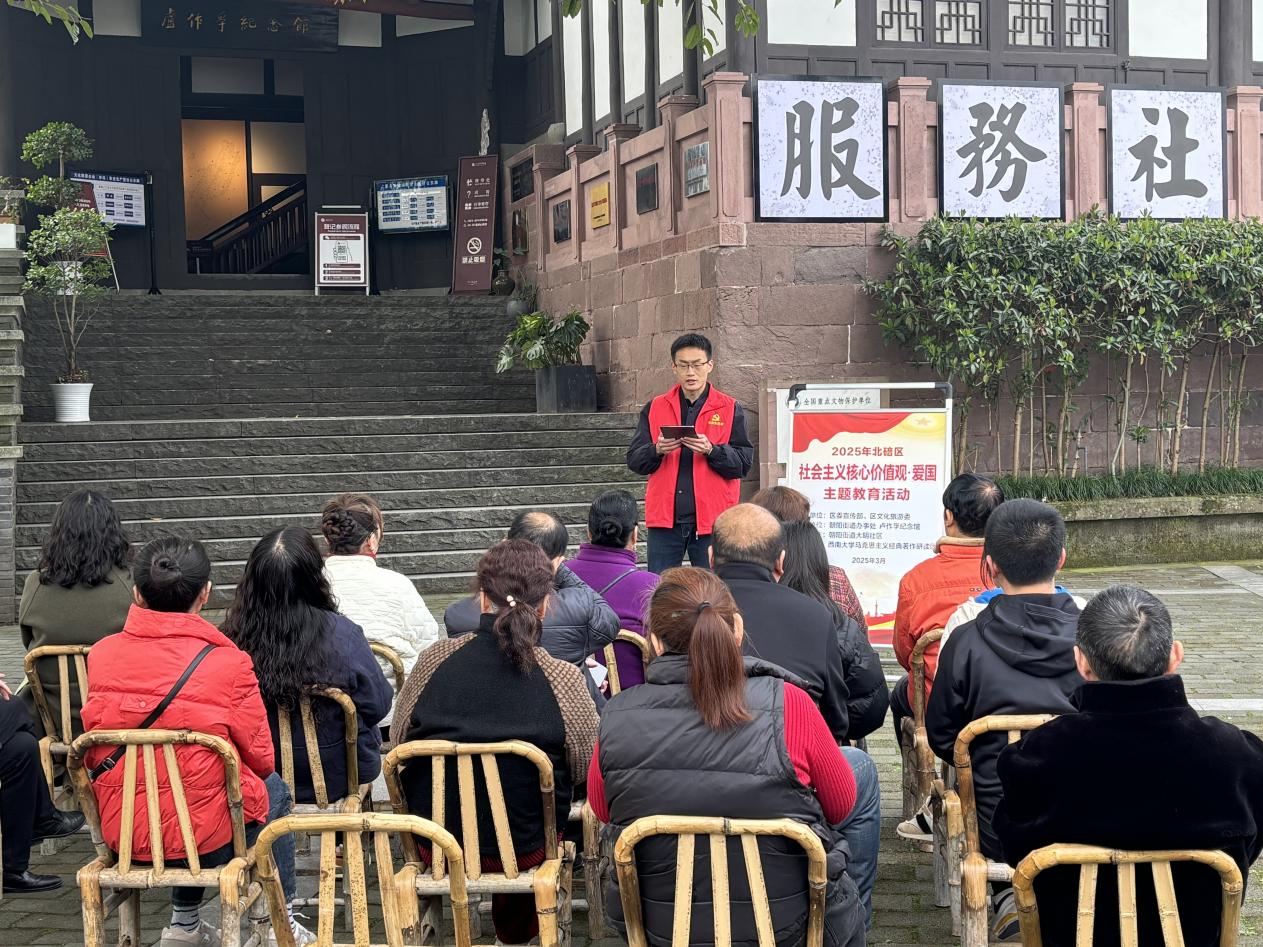 为进一步培育和践行社会主义核心价值观,推动社区形成崇德向善、见贤思齐的良好风尚,2025年3月20日上午,必赢3003no1线路检测中心马克思主义经典著作研读团走进北碚区朝阳街道大明社区开展了以“践行社会主义核心价值观,共筑美好社区家园”为主题的宣讲活动。