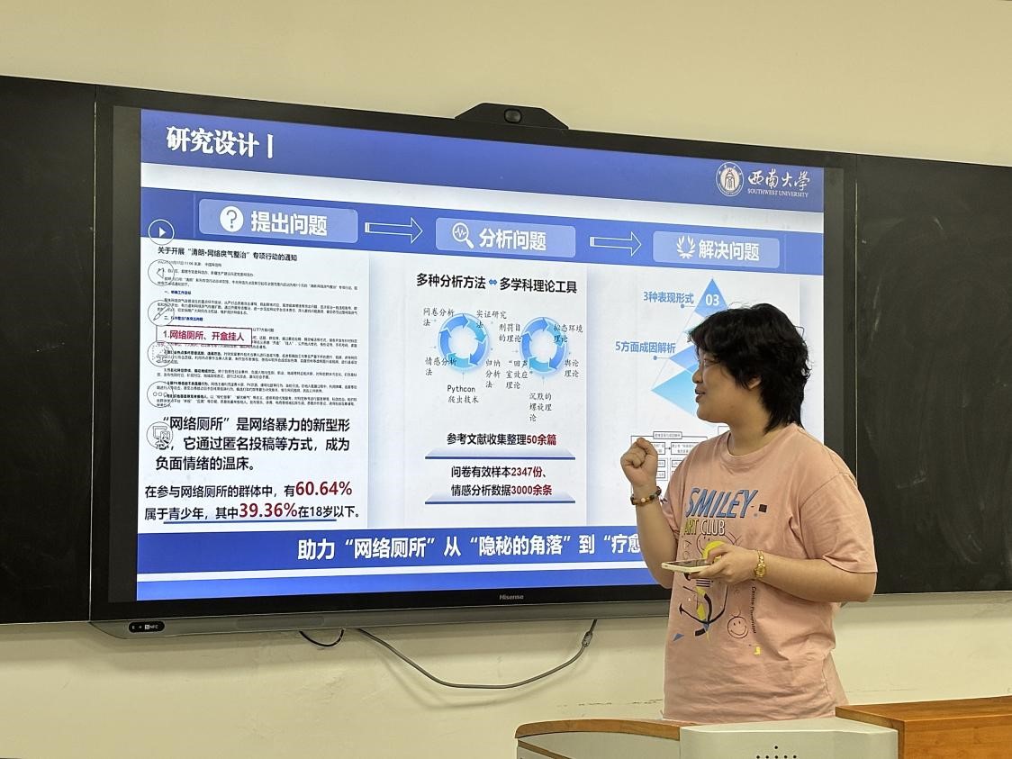 第十九届“挑战杯”全国大学生课外学术科技作品竞赛2024年度“揭榜挂帅”专项赛全国一等奖获得者黄诗睿同学与专项赛全国三等奖获得者贺丹同学,依次上台分享获奖项目的主要内容、研究历程与成功经验。她们从项目选题、团队组建、报告撰写等方面展开了全面深入的讲解,为在场同学们提供了极具参考价值的宝贵经验。现场同学踊跃提问,气氛热烈。
