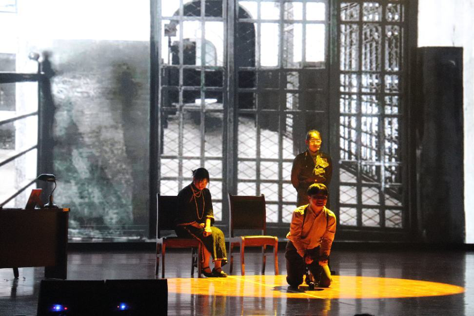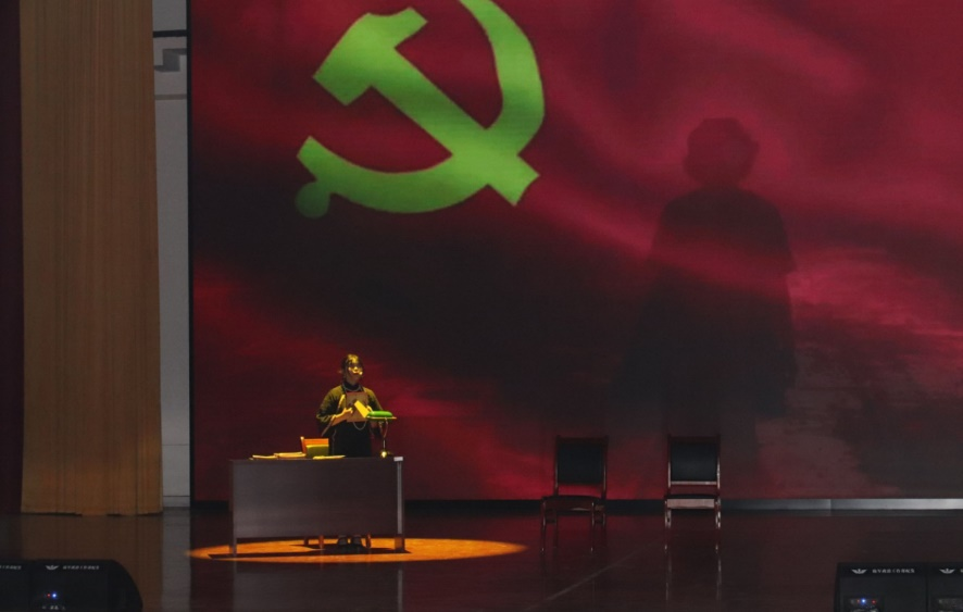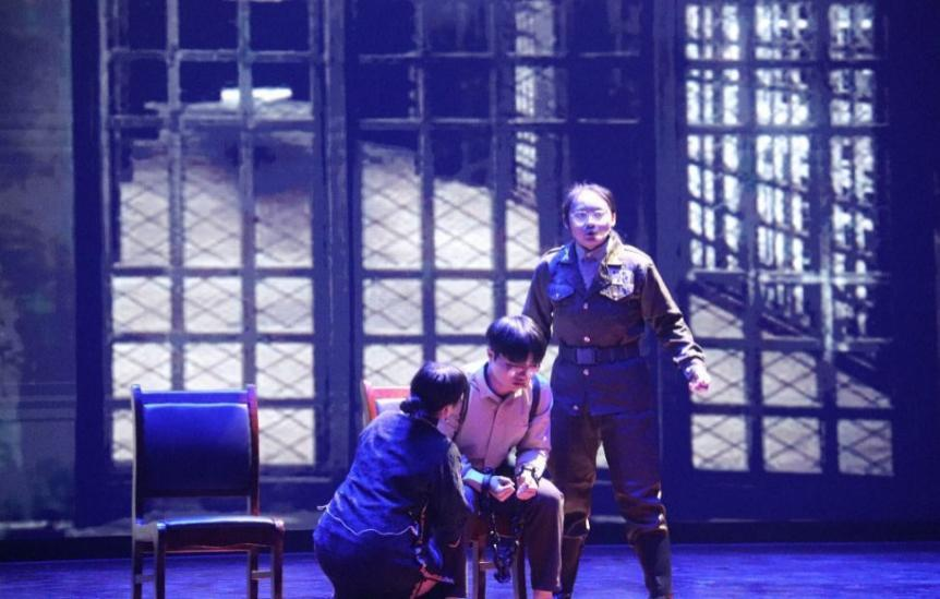 在表演中,张伟杰、钟若楠和张星瑶同学分别扮演话剧中三位主角——主人公王朴、王朴的母亲金永华女士、国民党特务。除台上的演员外,还有同行的剧社成员负责音乐背屏、灯光、道具和摄影等幕后工作。三位演员用精湛的演技与真实的情感流露将台下的观众带回到解放黎明前的黑暗时刻,感悟革命年代先辈们艰苦奋斗不怕牺牲的革命情怀。