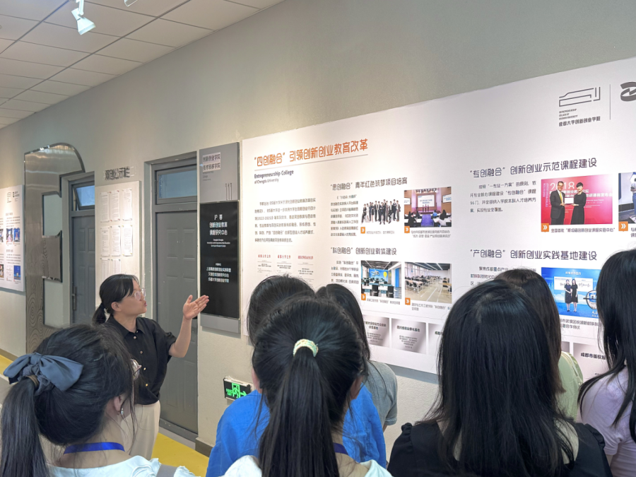 开班仪式后,实践研修团队旋即投入首日现场教学活动。在虚拟仿真实验室,师生通过先进的虚拟仿真课程应用软件、VR沉浸式红色骑行、佩戴VR头盔一体机等方式,“穿越”到历史场景,身临其境地感受革命历程的艰辛与伟大,深刻体会到科技赋能思政教育的创新魅力。在成都大学中国-东盟艺术学院,师生“零距离”接触观摩传统竹编、蜀绣团扇制作、蜡染技艺、大漆艺术、陶瓷绘画、手工造纸等多个非遗项目后,纷纷为传统技艺与现代技术、设计理念的巧妙融合而赞叹,切身感受到中华优秀传统文化的深厚底蕴及其在新时代的创造性转化与创新性发展。在成都大学创新创业学院,该院副院长李瑞瑾详细介绍了CC空间的功能分区、运营模式、学习小站以及在大学生创新创业项目中的孵化成果,通过现场展示的鲜活案例与实践经验,生动诠释着如何将思政教育融入创新创业实践、通过产教融合切实提升学生综合素质。